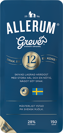 Allerum Grevé® skivad hårdost 150g med 28% fetthalt som långlagrats i 12 månader, vilket gör den extra rund och fyllig. Aromrikedomen och den sötaktiga nötkaraktär gör den till en generös ost som passar lika bra på mackan som på ostbrickan. Mästerligt ystad på svensk mjölk i Kristianstad. Att smak är en konst är något vi alltid skriver under på. För oss är ost ett ständigt skapande. Perfektion är vårt signum.