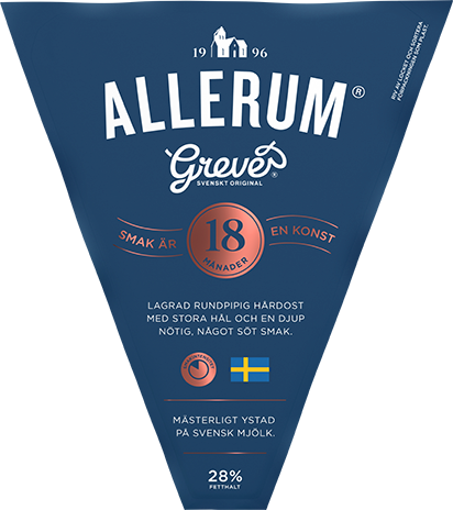 Allerum Grevé® 28% 18 månader 670g är en lagrad rundpipig hårdost med stora hål och en djup nötig, något söt smak. Den längre lagringen ger osten en större smak och mer karaktär. Mästerligt ystad på svensk mjölk i Kristianstad. Passar utmärkt på frukostmackan, på ostbrickan, i matlagningen eller som en smakbit mellan målen. Att smak är en konst är något vi alltid skriver under på. För oss är ost ett ständigt skapande. Perfektion är vårt signum.