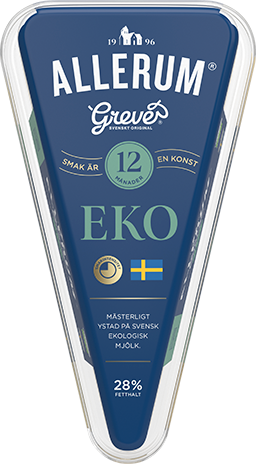 Allerum Grevé® EKO 28% 12 månader 400g är en lagrad ekologisk rundpipig hårdost med stora hål och en nötig, något söt smak. Mästerligt ystad på svensk ekologisk mjölk i Kristianstad. Passar utmärkt på frukostmackan, på ostbrickan, i matlagningen eller som en smakbit mellan målen. Den praktiska förpackningen är enkel och bekväm att använda och fungerar både som serveringsfat och som emballage tills ostbiten är slut. Kupan är snygg att ha framme på bordet och ser dessutom till så att osten håller sig saftig och fräsch. Sortera kupan som plast, den är 100% återvinningsbar. Att smak är en konst är något vi alltid skriver under på. För oss är ost ett ständigt skapande. Perfektion är vårt signum.