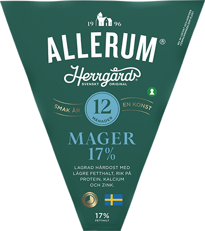 Allerum Herrgård® Mager 17% 12 månader 675g är en lagrad rundpipig hårdost med lägre fetthalt och har en nötig arom och ren, fyllig smak. Den är naturligt rik på protein, kalcium och zink. Mästerligt ystad på svensk mjölk i Kristianstad. Passar utmärkt på frukostmackan, på ostbrickan, i matlagningen eller som en smakbit mellan målen. Att smak är en konst är något vi alltid skriver under på. För oss är ost ett ständigt skapande. Perfektion är vårt signum.
