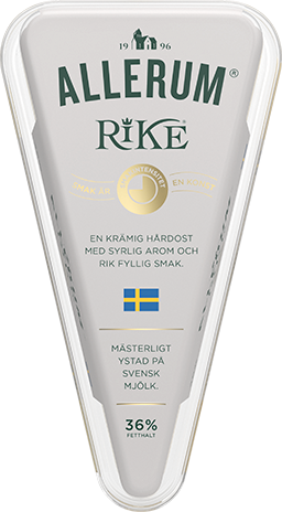 Allerum Rike® är en lagrad hårdost 375g med 36% fetthalt. Rike® är en helt ny ost från Svea rike som smälter i munnen, ett helt nytt smakrike. Rike® har en komplex smak med utvecklad gräddighet med en balanserad syrlighet och sälta. Texturen är krämig och osten smälter i munnen. Smak av umami, lätt sötma och fruktiga toner. Mästerligt ystad på svensk mjölk i Kristianstad. Den praktiska förpackningen är enkel och bekväm att använda och fungerar både som serveringsfat och som emballage tills ostbiten är slut. Kupan är snygg att ha framme på bordet och ser dessutom till så att osten håller sig saftig och fräsch. Att smak är en konst är något vi alltid skriver under på. För oss är ost ett ständigt skapande. Perfektion är vårt signum.